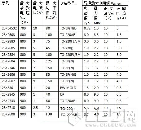根據(jù)下面功率MOSFET表3.7,可以選擇2SK2718型號。它的最高承受電壓為900V,允許最大電流為2.5A,而功率損耗是40W,是上面功率最小損耗的。