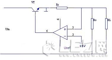 下圖是恒流電源常用電路,其中采樣電阻RS串聯(lián)在功率回路里,作為回路電流的采樣元件。它把回路電流轉換成電壓信號,并與基準電壓Uref在放大器中進行比較放大,然后將其送至調(diào)整管VT的基極,驅動調(diào)整管VT對輸出電流IO變化進行補償校正。就可以實現(xiàn)恒流輸出的。