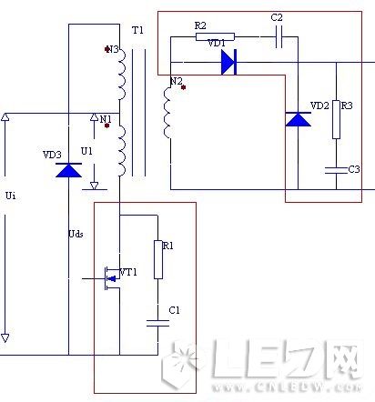 在開關電源中,由于變壓器的漏感、布線的引線電感存在、開關管在關斷瞬間會產(chǎn)生很高的電壓尖峰脈沖。整流快速恢復二極管由于存在存儲效應,反向恢復過程中也會出現(xiàn)很高的反向恢復的碾壓尖峰脈沖。這些過電壓尖峰脈沖的出現(xiàn)不但危及功率器件的工作安全性,而且形成很強的電磁干擾噪聲。為此必須在功率器件兩端設計尖峰電壓緩沖吸收電路。緩沖電路圖如圖中紅框部分: