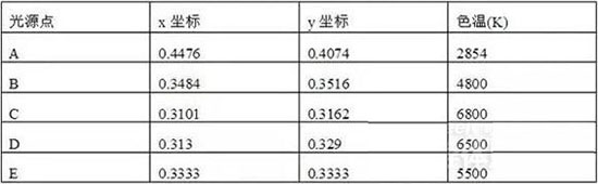 對于三原色紅(R)、綠(G)、藍(B),x=R/(R+G+B),y=G/(R+G+B),z=(R+G+B)。由于x+y+z=1,所以只需給出x和y的值,就能唯一確定一種顏色,這就是通常所說的色度圖。若以若以x、y作為平面坐標系,用比色實驗法測出自然界中各種色彩的x、y值,并將其繪在該坐標平面內(nèi),便可得到色度圖。該色度圖邊沿舌形曲線上的任一點都代表某一波長光的色調(diào),而曲線內(nèi)的任一點均表示人眼能看到的某一種混合光的顏色。其中,白光區(qū)域的特征點A.、B、C、D、E的色坐標值的色溫度值見下表。