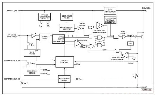 該LYTSwitch-4控制器包括:一個(gè)振蕩器、反饋(檢測及邏輯)電路、5.9V穩(wěn)壓器、遲滯過熱保護(hù)、頻率抖動、逐周期電流限制、自動重啟、電感校正、功率因數(shù)和恒定的電流控制。圖1為LYTSwitch-4控制器的系統(tǒng)框圖。